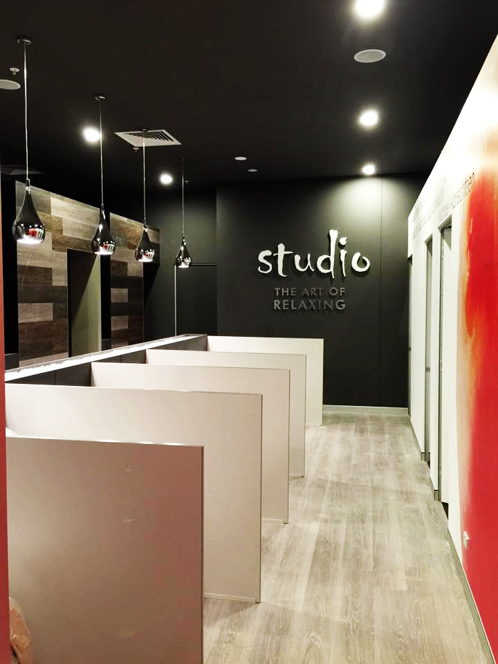 Studio Massage, located in Lakeside Joondalup Shopping City, features an atmospheric colour scheme painted in black from wall to ceiling.